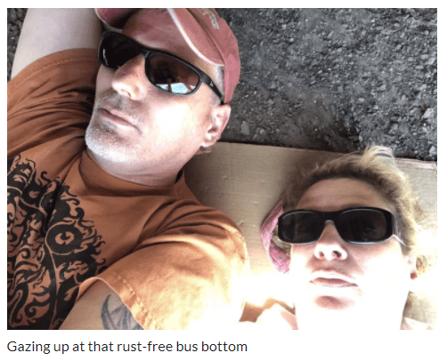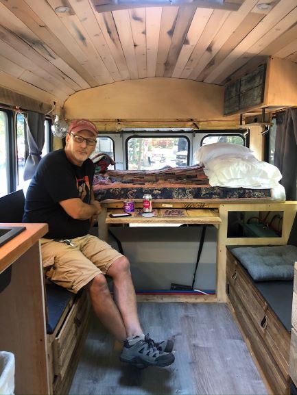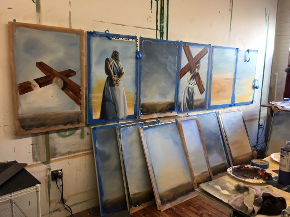 Back in his studio, he paints on panels he can stack — “It isn’t art unless it fits ifn the back of your vehicle”….