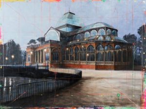 From left: “Greenhouses,” 2016, acrylic on panels, 8×8′; “Crystal Palace, Retiro/Madrid,” 2017, acrylic on panels, 6×8′; “Middle School,” 2020, acrylic on panel, 44×38″