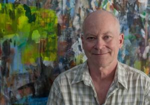 He uses thinned acrylic paints, applying them in “a regime of stains”…