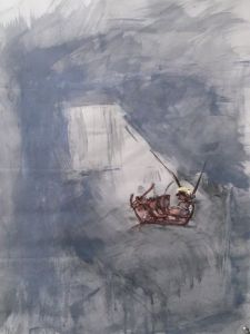 A twig, charcoal on brown paper, 36.5×48″; Gregor Samsa from Kafka’s Metamorphosis, charcoal on gray paper, 19×25″. (I added the yellow hair as a political commentary this year.)