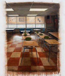 Painter Peter Waite says he works at the intersection of private and public memory. A classroom, for example, may remind the viewer of their own school days. His subject matter is largely drawn from his domestic and international travels, and, except in occasional paintings of statuary, devoid of figures, instead depicting “a scene just before you enter and one last take before you leave.”