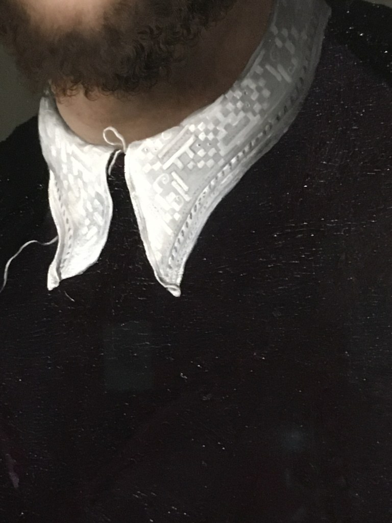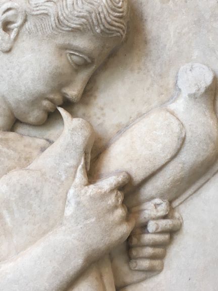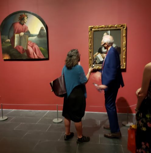 Shown in profile like the portrait of Dante — both with prominent noses — to her left in the exhibit.