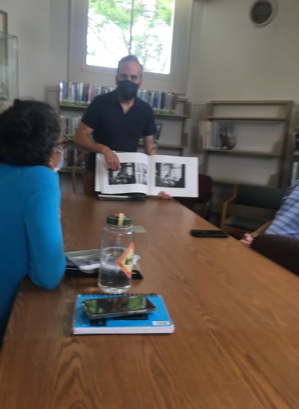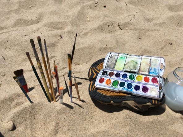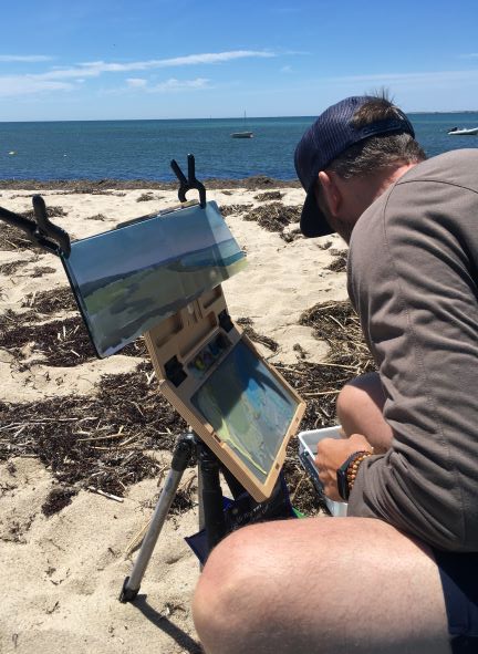 Most of these are self-explanatory, but here’s some info about those that may not be. The 1st image is of our workshop leader Aaron Thompson. In the row below, that red photo slide is something he looks through to heighten the values. Next to that image is our group heading into the town library to draw on what was our only rainy morning. Had to snap a pic of that Open Studio sign! The photo under the Cher poster is of amazing P’town/Truro landscape painter Peter Hocking (@p.hocking), who was featured on the radio show, with my pal Mari. The penultimate photo is the interior of one group member’s waterfront summer place; she kindly invited us to paint on the beach the last day of the workshop. Another member provided a bowl of salt water taffy!