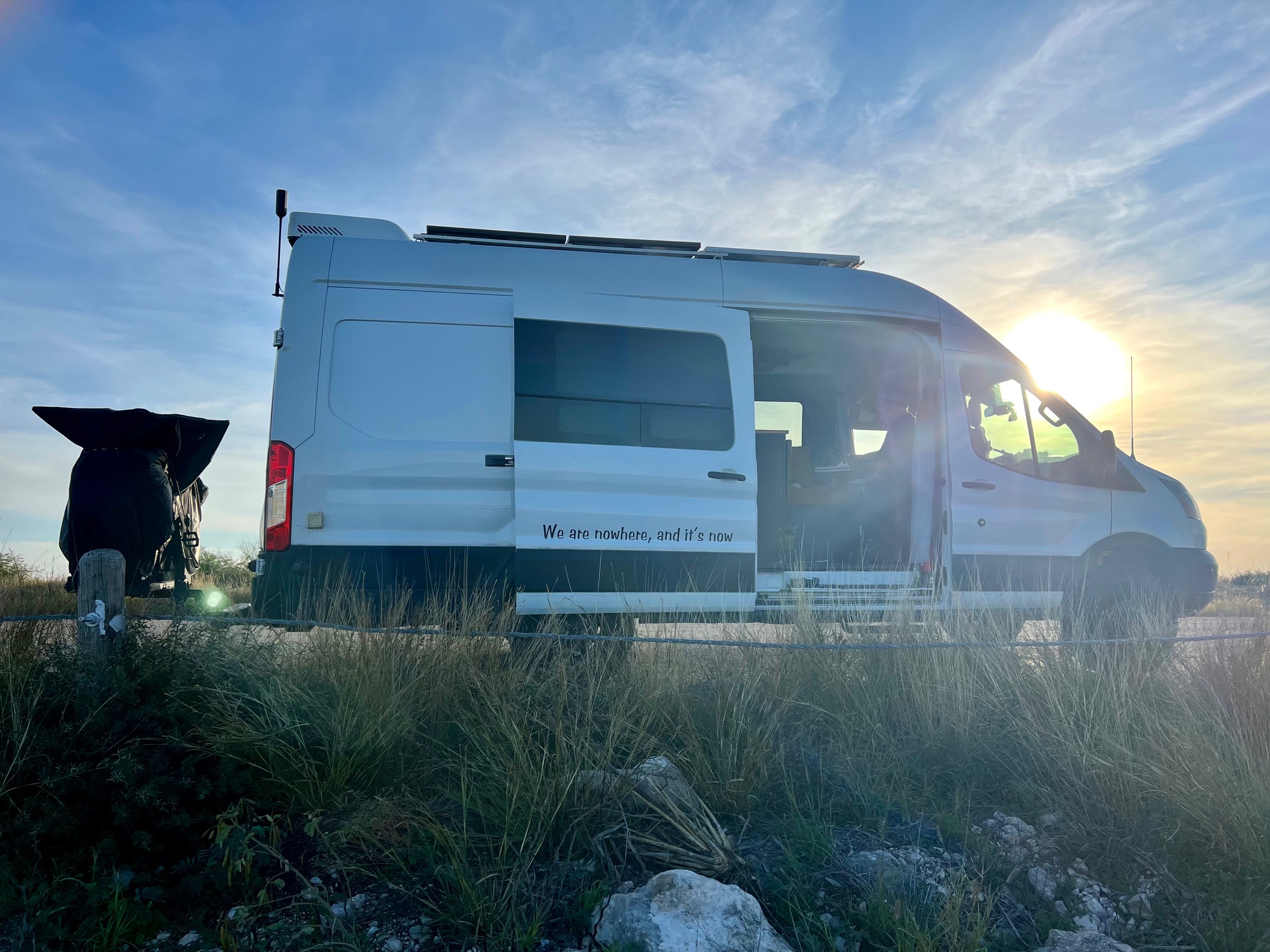 So. A year and three quarters in, how’s it going? We talked via Zoom from where they were parked – now in a new smaller, if you can believe it, vehicle, which they call their Nowhere Van, at a Texas truck stop. (We were reliant on the kindness of the hot spot gods so apologies for any audio anomalies!)
