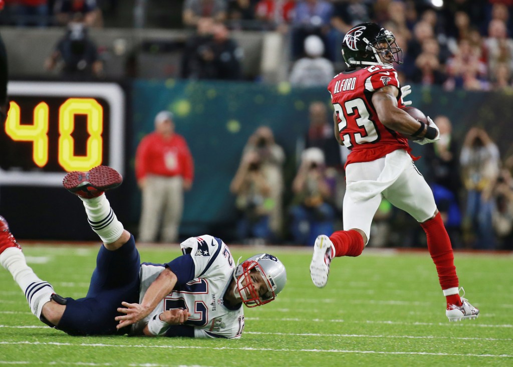 Falcons Robert Alford runs a Tom Brady interception back for a touch down in the 2nd quarter.