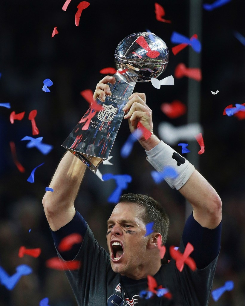 Head coach Bill Belichick gets a hug from his father Steve Belichick minutes before the end of the game. Patriots won 24-21. Photo by Bob BreidenbachSunday, February 5, 2017 Houston, TX The New England Patriots vs The Atlanta Falcon at Super Bowl LI, NRG Stadium, Houston, TX Tom Brady celebrates with the Lombardi Trophy after the game. The Providence Journal / Bob BreidenbachSunday September 9, 2012