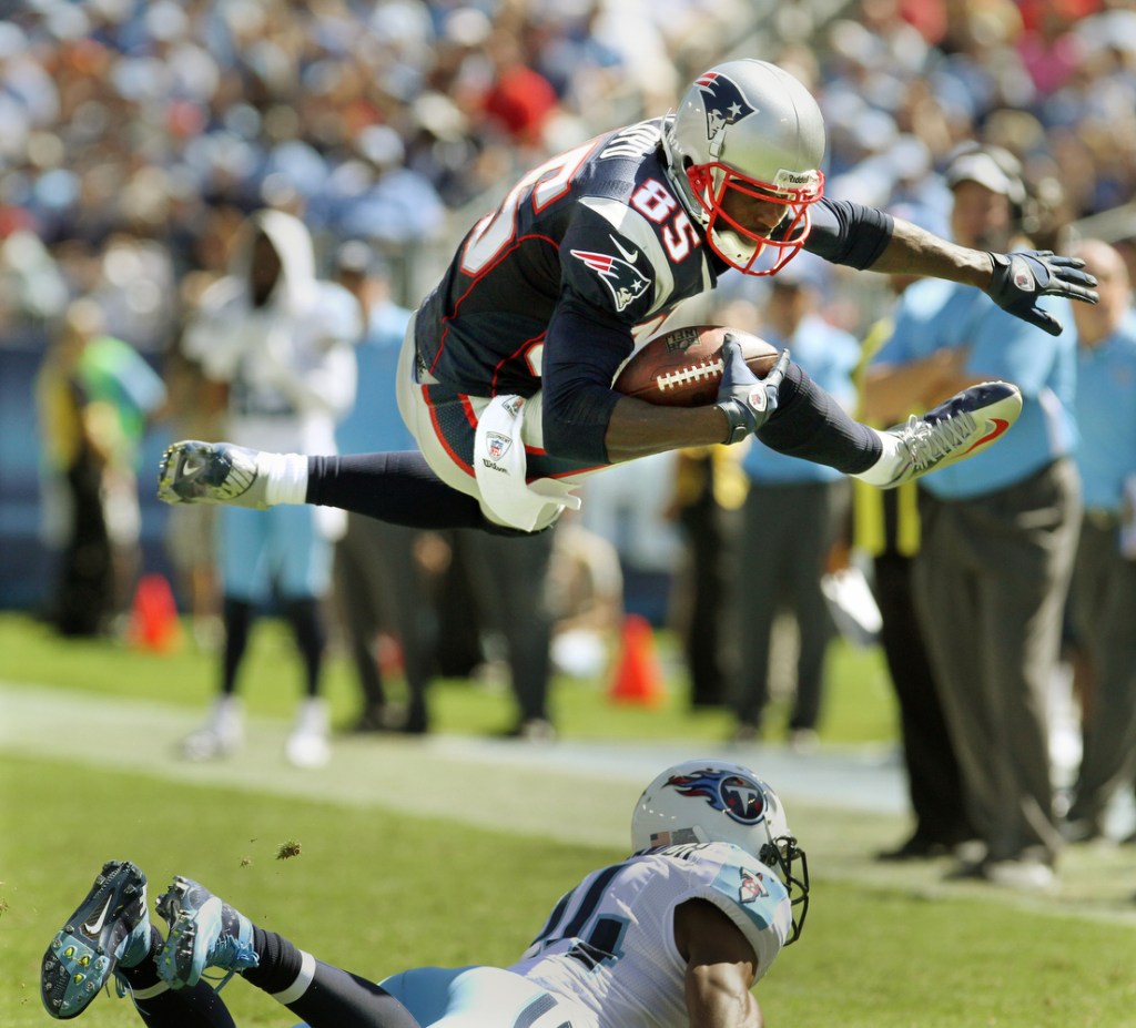 Patriots receiver #85 Brandon Lloyd leaps over Titan defender #24 Coty Sensabaugh in a 3rd quarter driv e that resulted in a Patriots touchdown by Stevan Ridley to give the Patriots a 28-10 lead.