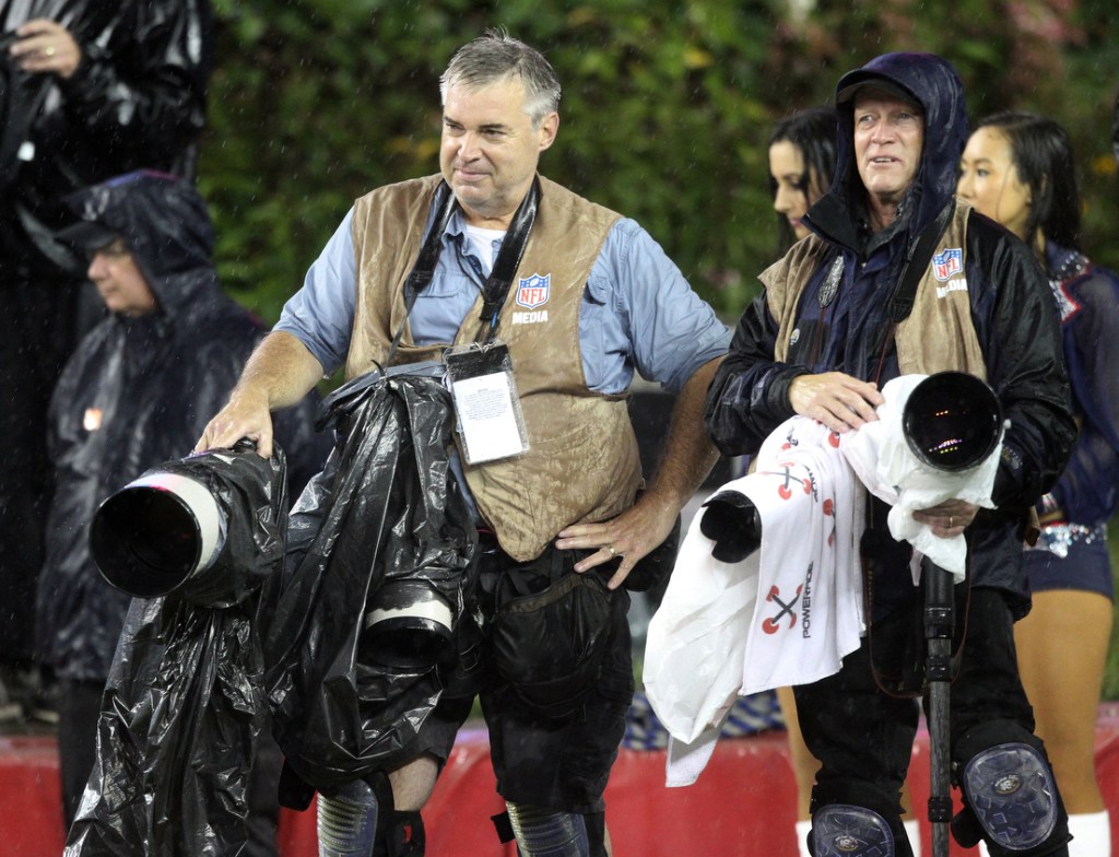 PATS JETS MM 17 — Photographers Bob Breidenbach and Jim Davis brave the pouring rain the 2nd half as the New England Patriots open their 2013 season at home against the New York Jets. The Providence Journal/Mary Murphy