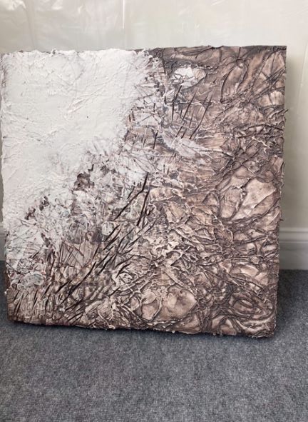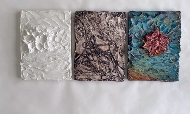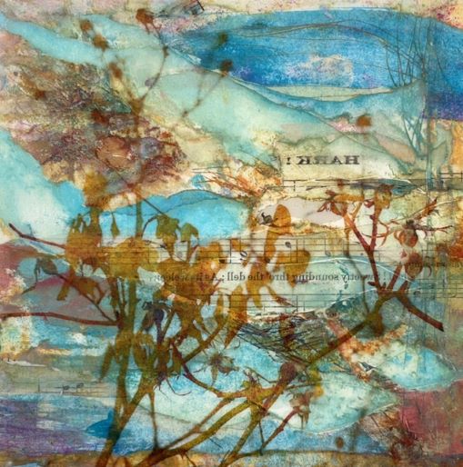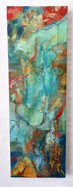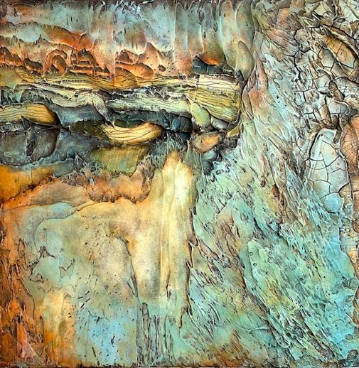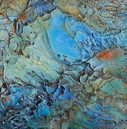 Today, a visit with mixed media artist Kelly Taylor, whose work is abstract and inspired by her love of nature. I find it deliciously goozhy. The work looks to be built up of layers and layers of thickly applied paint, but as we’ll learn as she describes her process, there’s more than paint under there. And as for her tools, we’re talking everything from palette knives to dental picks. Kelly started her art life making collages, but over years of art making, taking workshops, doing residencies, and meeting regularly with likeminded artists in what she calls her tribe, she’s worked in all manner of media. “I’ve never wanted to be idn that little square of just doing one thing. …You have to be willing to experiment and make a mess, not thinking you’re creating a finished piece of art.”