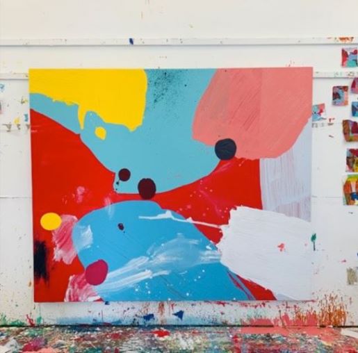Orion’s Belt, acrylic on canvas, 60″x72″, shown in Cat’s studio